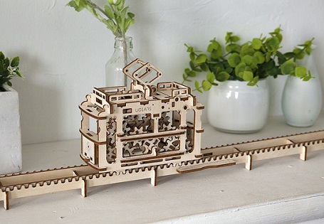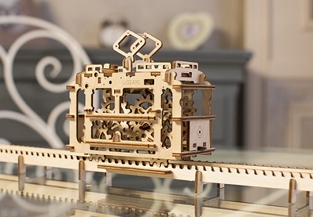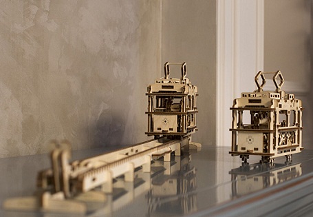 Оригинальный и миниатюрный Трамвай признан самой романтичной механической моделью компании UGEARS. В комплекте с трамвайчиком есть специальные рельсы, по которым механическая модель ездит назад и вперед, перевозя любовные записки.