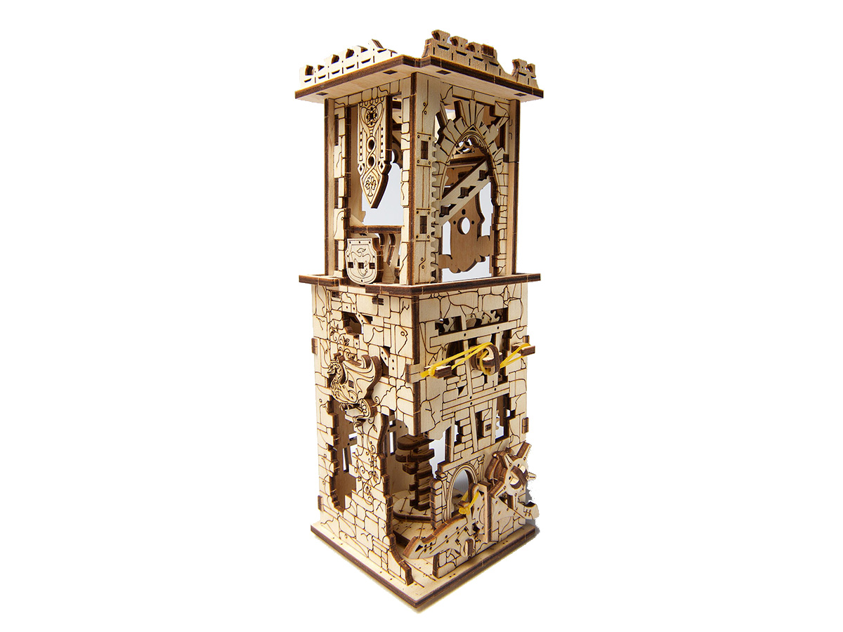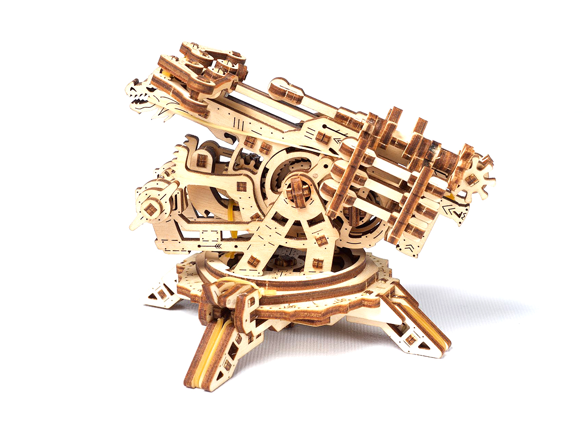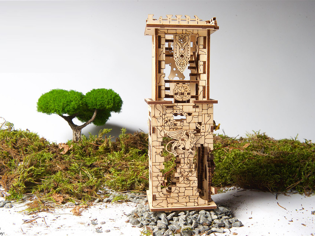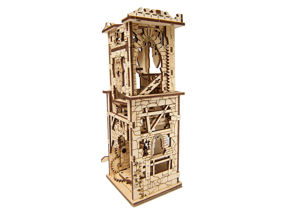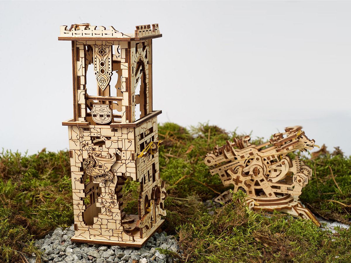 3D-пазл Башня-аркбаллистаот UGears – модель, вдохновленная лучшими примерами древней артиллерии в литературе и художественных фильмах. Этот пазл состоит из двух частей: осадочная машина и механическая башня. Сама баллиста стреляет деревянными болтами. С помощью механизмов можно выставить на башне необходимый угол по горизонтали и вертикали, чтобы вести максимально прицельный огонь.