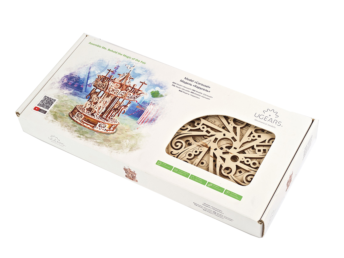 Карусель выполнена из обработанной фанеры, не оставляющей заусенцев. Габариты упаковки составляют 37,8 × 17 × 4,2 см, габариты сборной модели — 21 × 21 × 26 см. В комплекте — 300 деталей для сборки.