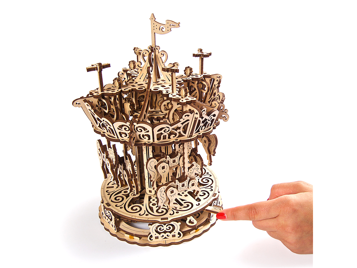 Движение карусели возможно благодаря резиномотору, спрятанному в конструкции. Один поворот специального рычага — и карусель придет в движение: она будет крутиться, лошадки двигаться вверх и вниз. Даже центральный столб придет в движение, крутясь в противоположную сторону, чтобы создать ощущение, что карусель закручивается еще быстрее.
