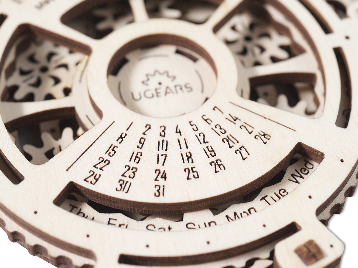 3D-пазл UGears Механический календарь представляет собой сложную многоуровневую конструкцию, которая при первом взгляде похожа на древнейший астрологический компьютер — астролябию. Если древний инструмент астрологов изготавливался из латуни и высчитывал время появления звезд, то оригинальный 3D-пазл UGears сделан из дерева и считает дни.