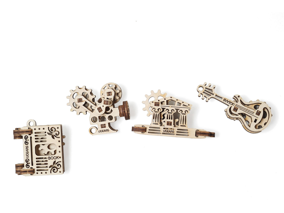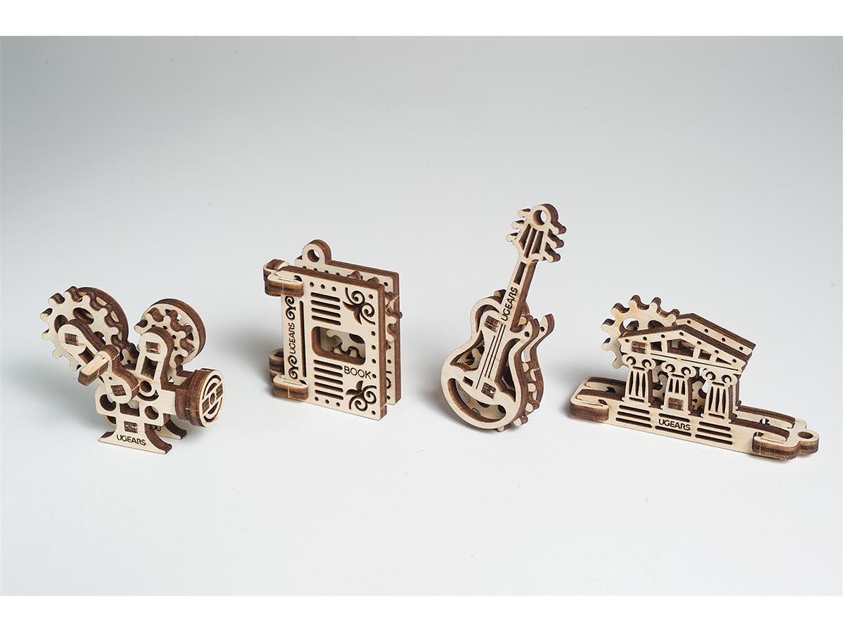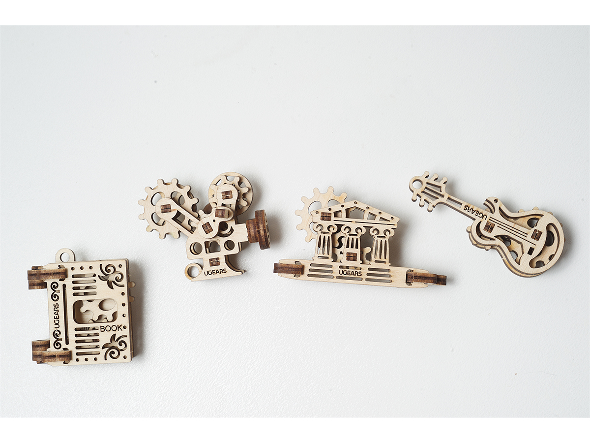 Набор от UGears Фиджет Творчество состоит из 48 деталей, из которых можно собрать 4 небольших модели: Гитара, Книга, Кинокамера и Парфенон. Каждая модель дает общее представление об устройстве механики: покрутив одну шестеренку маленькой модели, начнут крутиться остальные. Таким образом, можно наглядно познакомиться с работой простейших механизмов. После сборки модели можно использовать в качестве антистресс-игрушек или в качестве брелоков для ключей.