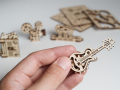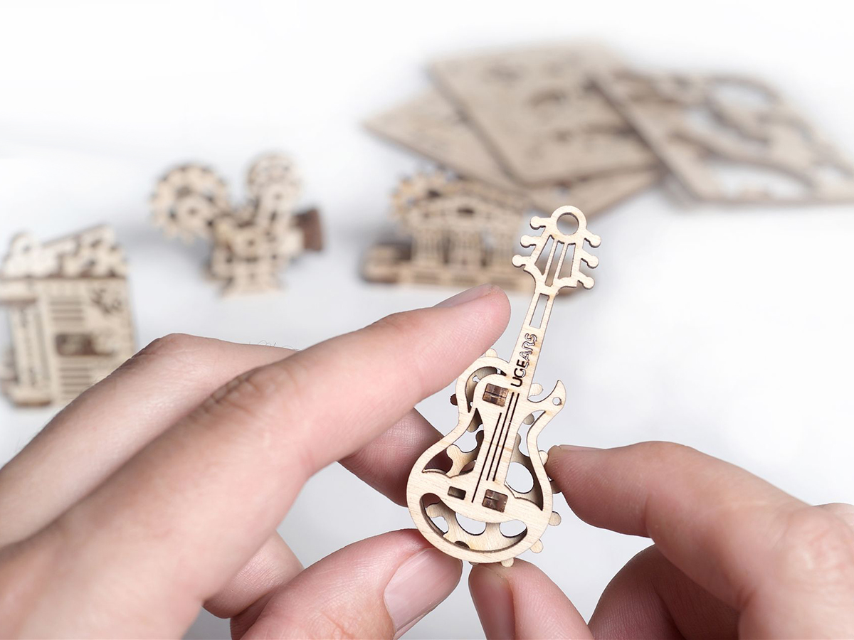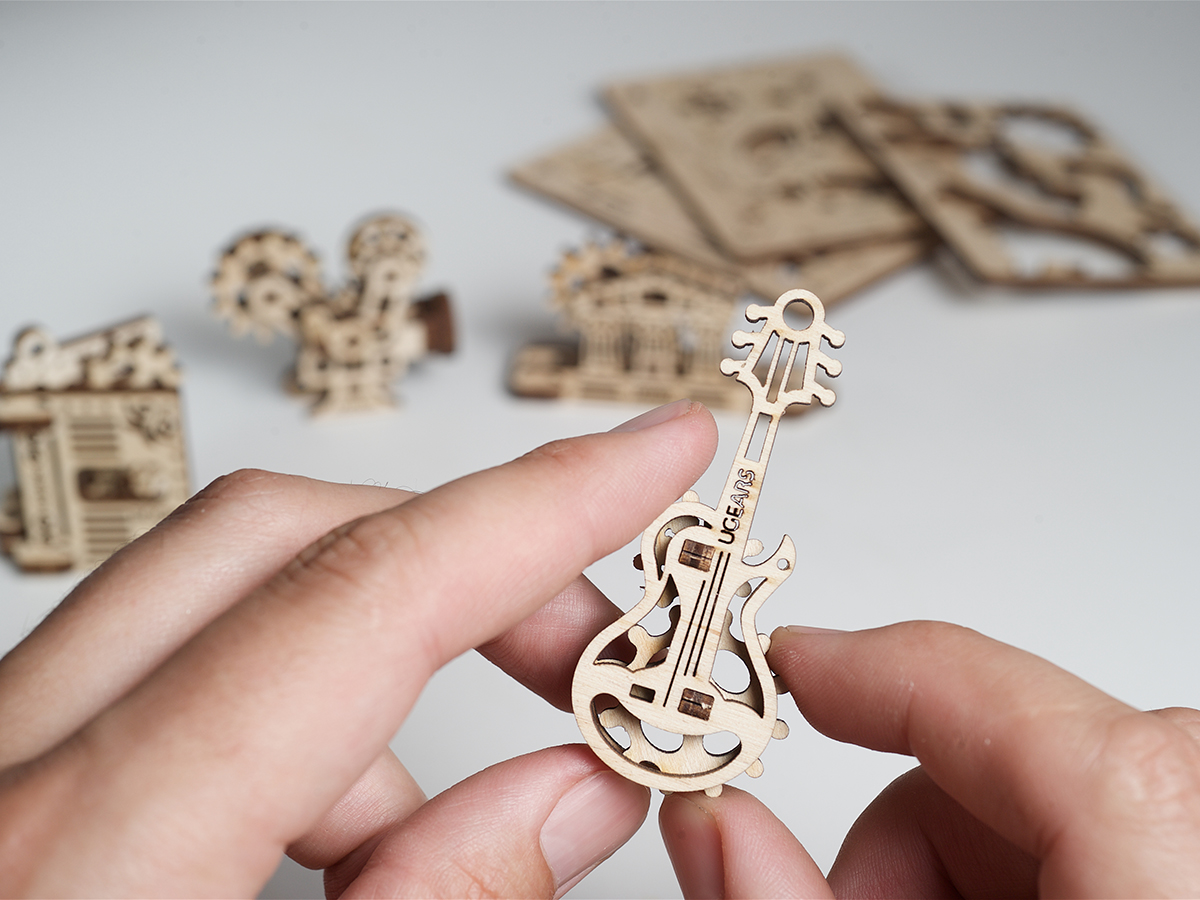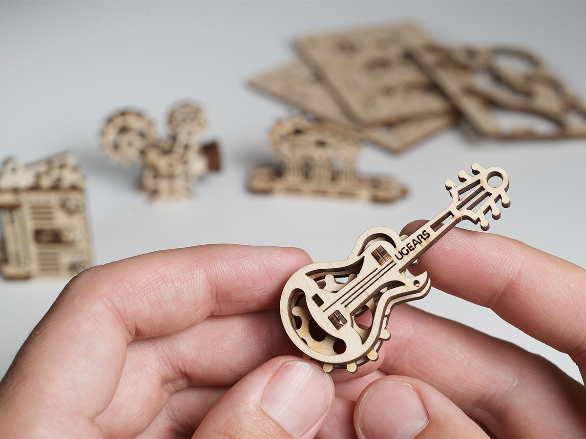 Набор от UGears Фиджет Творчество состоит из 48 деталей, из которых можно собрать 4 небольших модели: Гитара, Книга, Кинокамера и Парфенон. Каждая модель дает общее представление об устройстве механики: покрутив одну шестеренку маленькой модели, начнут крутиться остальные. Таким образом, можно наглядно познакомиться с работой простейших механизмов. После сборки модели можно использовать в качестве антистресс-игрушек или в качестве брелоков для ключей.