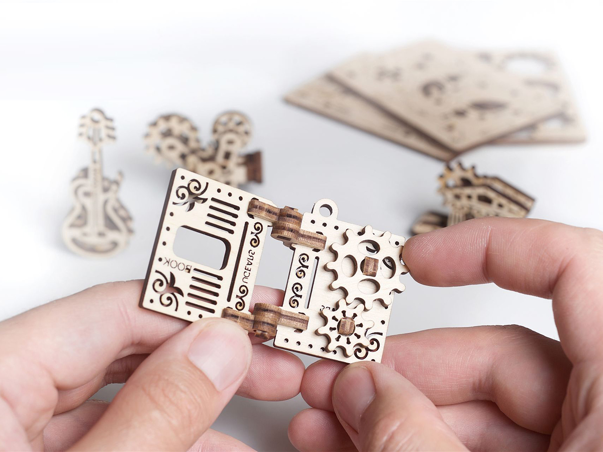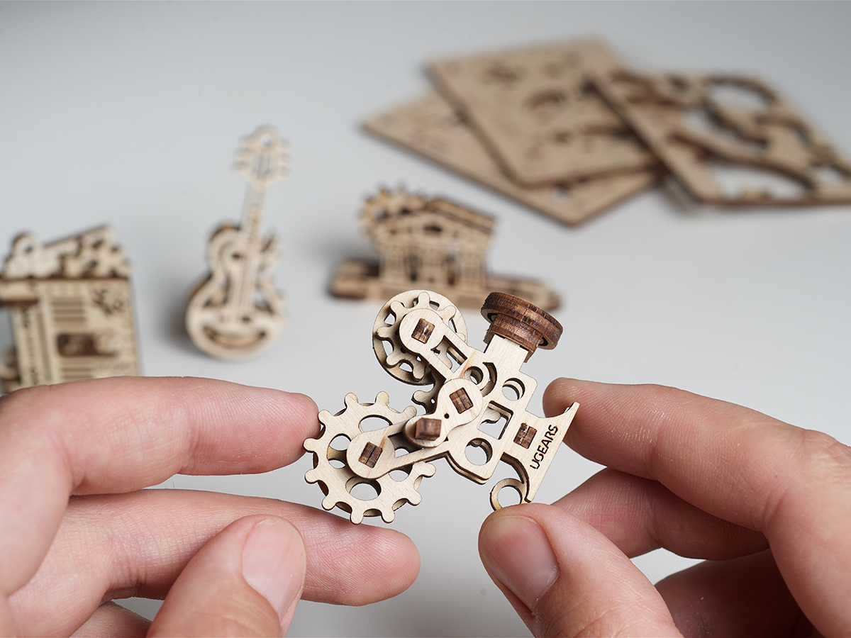 Для сборки моделей из набора Фиджет Творчество потребуется всего 10 минут. 3D-пазл UGears интересен и для взрослых, и для детей старше 5 лет. Модели собирается из деталей, которые поставляются в плоском планшете из фанеры. Они вырезаны с помощью программируемого лазера и легко извлекаются. Размер каждой модели ㅡ 3 х 4 х 7 сантиметров.