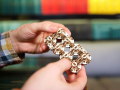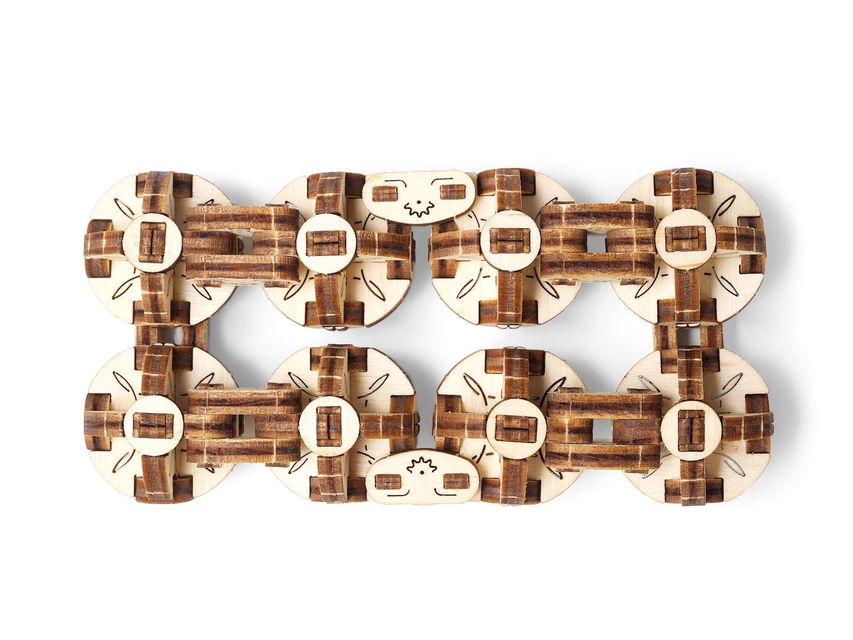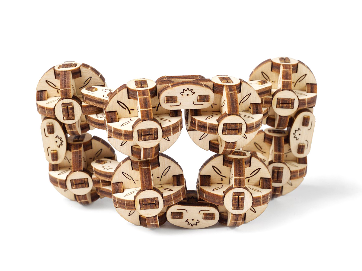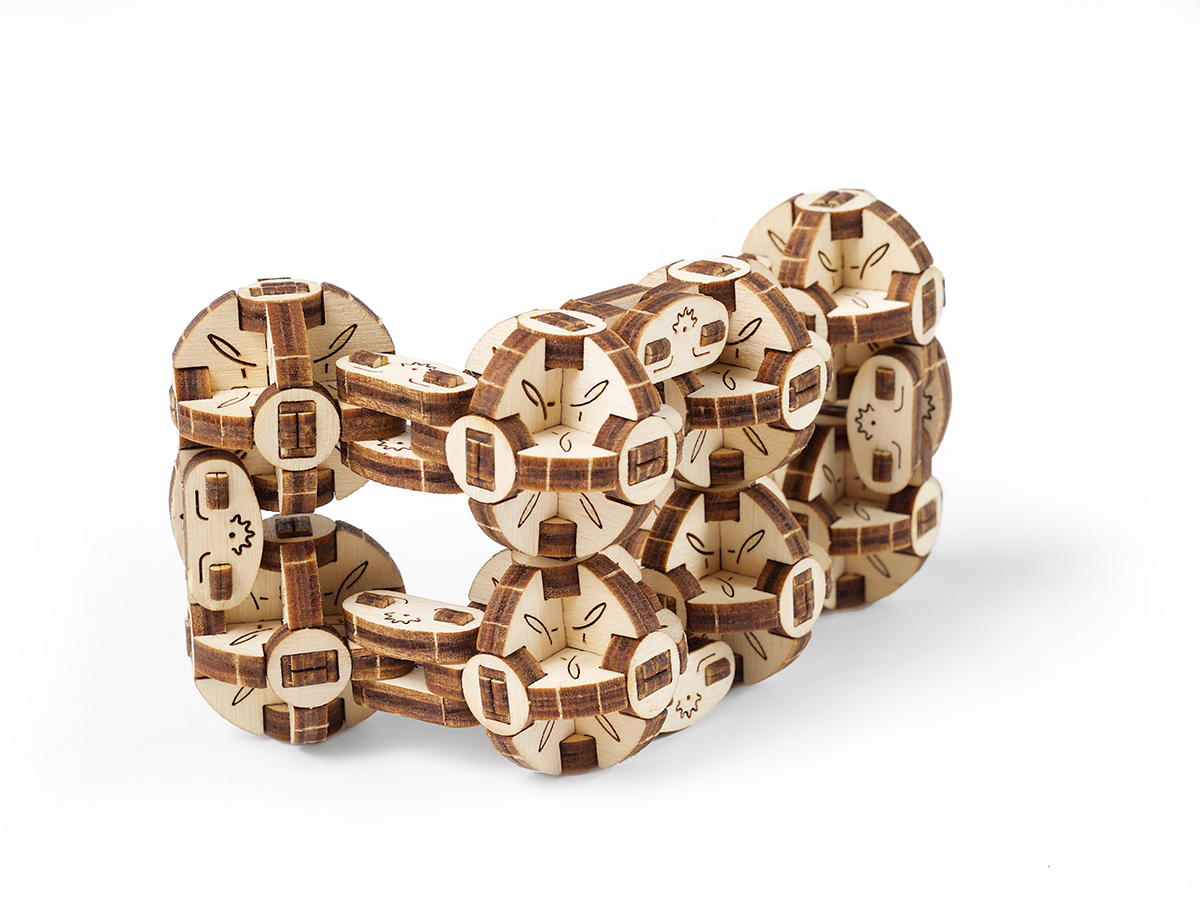Детали головоломки выполнены из фанеры и вырезаны при помощи программируемого лазерного станка. Модель собирается без клея: все детали соединяются между собой как трехмерная мозаика.