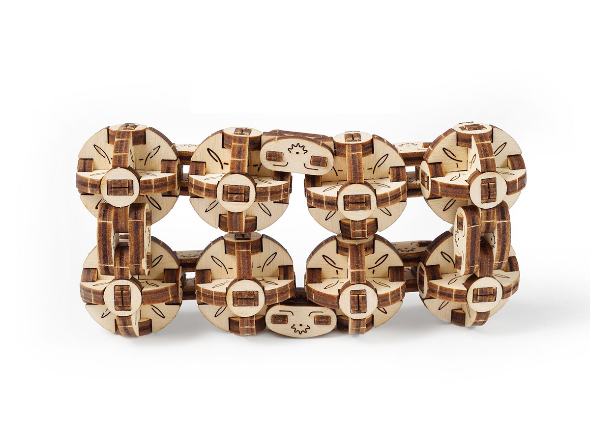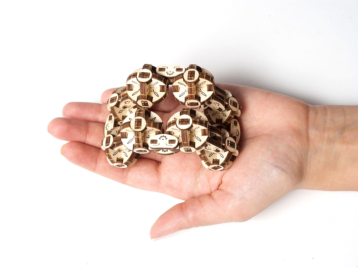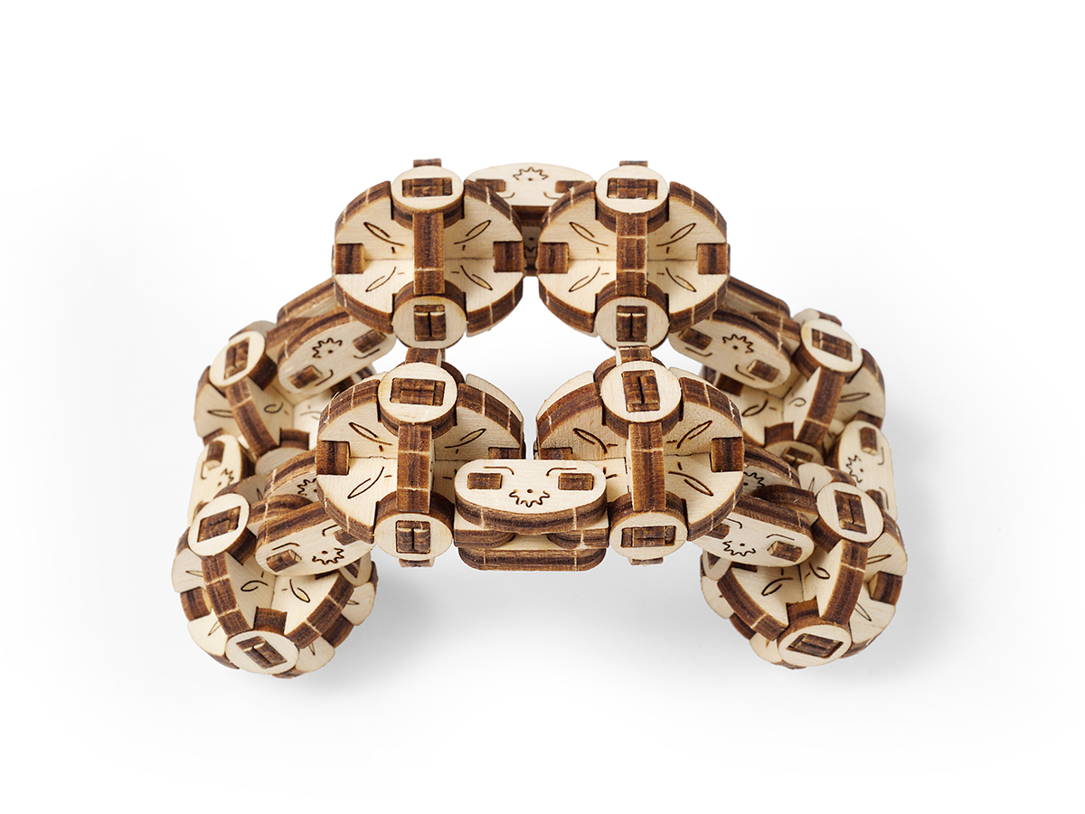 Продукция UGears – это 3D-пазлы, выполненные из экологичных материалов, которые собираются без клея и дополнительных инструментов. Среди линейки UGears есть и механическая головоломка-антистресс Сферокуб. Сферокуб представляет собой стимпанковый кубик. Он состоит из восьми сфер, которые соединены друг с другом. Благодаря этим сферам кубик перекатывается и приобретает всевозможные геометрические формы: прямоугольника, трехмерного куба, трапеции и т.д. Каждый сустав между сферами изгибается множество раз от одного к другому.