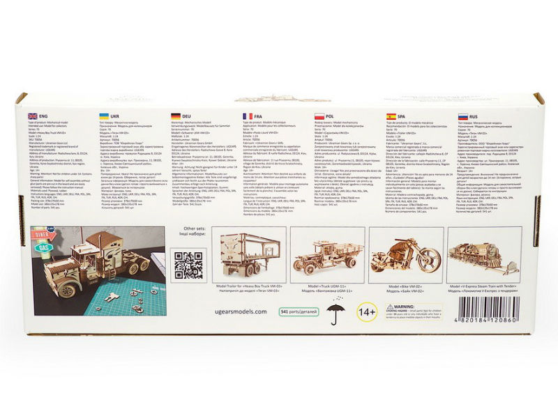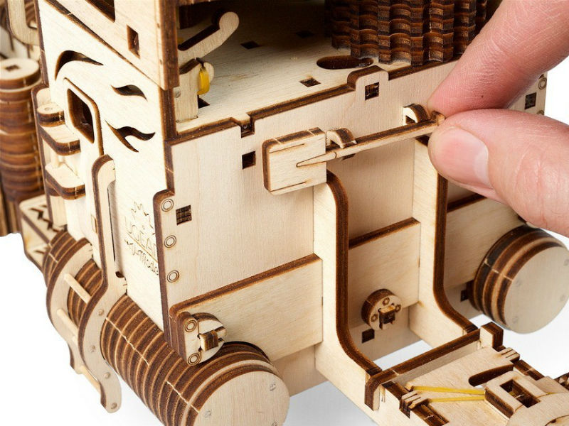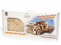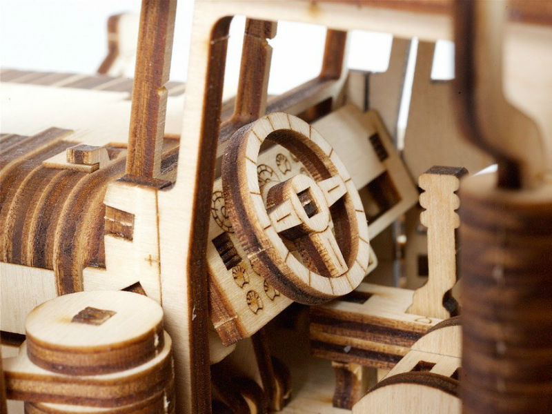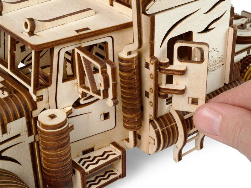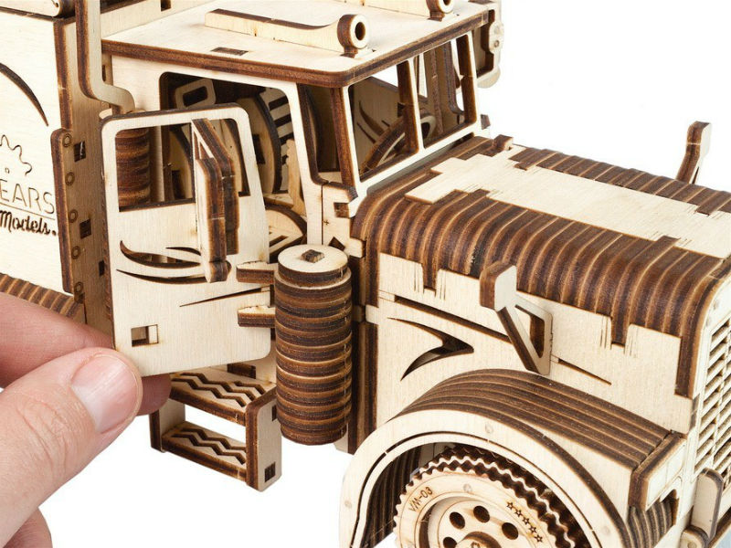 Все детали вырезаны профессиональным лазером на фанере. Достаньте заготовки из упаковки и выдавите части будущего тягача. Для сборки не нужны отдельные инструменты или клей, всё крепится на пазы. Красочная инструкция подробно опишет каждый этап. Тягач Heavy Boy VM-03 имеет резинодвигатель R6. С одного мотка трак проезжает около 5 метров. Реализованная в модели трансмиссия имеет 3 режима: вперед, назад и холостой ход.