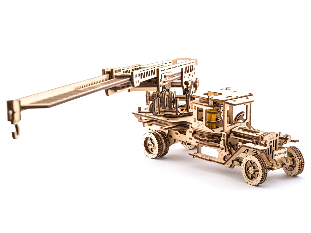 Выполненный в духе компании UGEARS, автомобильный кран представляет самоходную модель автомобиля с закрепленным на кузове краном. Стабильный в работе резиномотор посредством подвижных шестерен приводит в работу четырехцилиндровый двигатель. Сбоку модели есть небольшой рычаг, который с характерным щелчком переключает режимы: холостой ряд, вперед и назад.