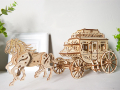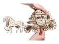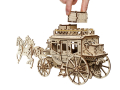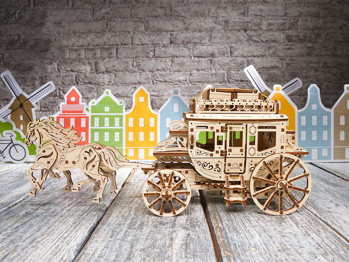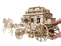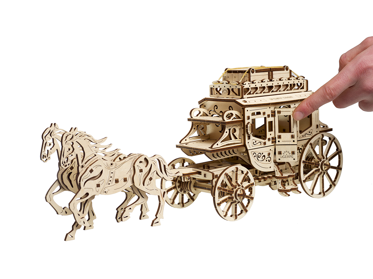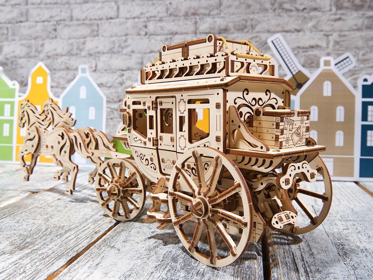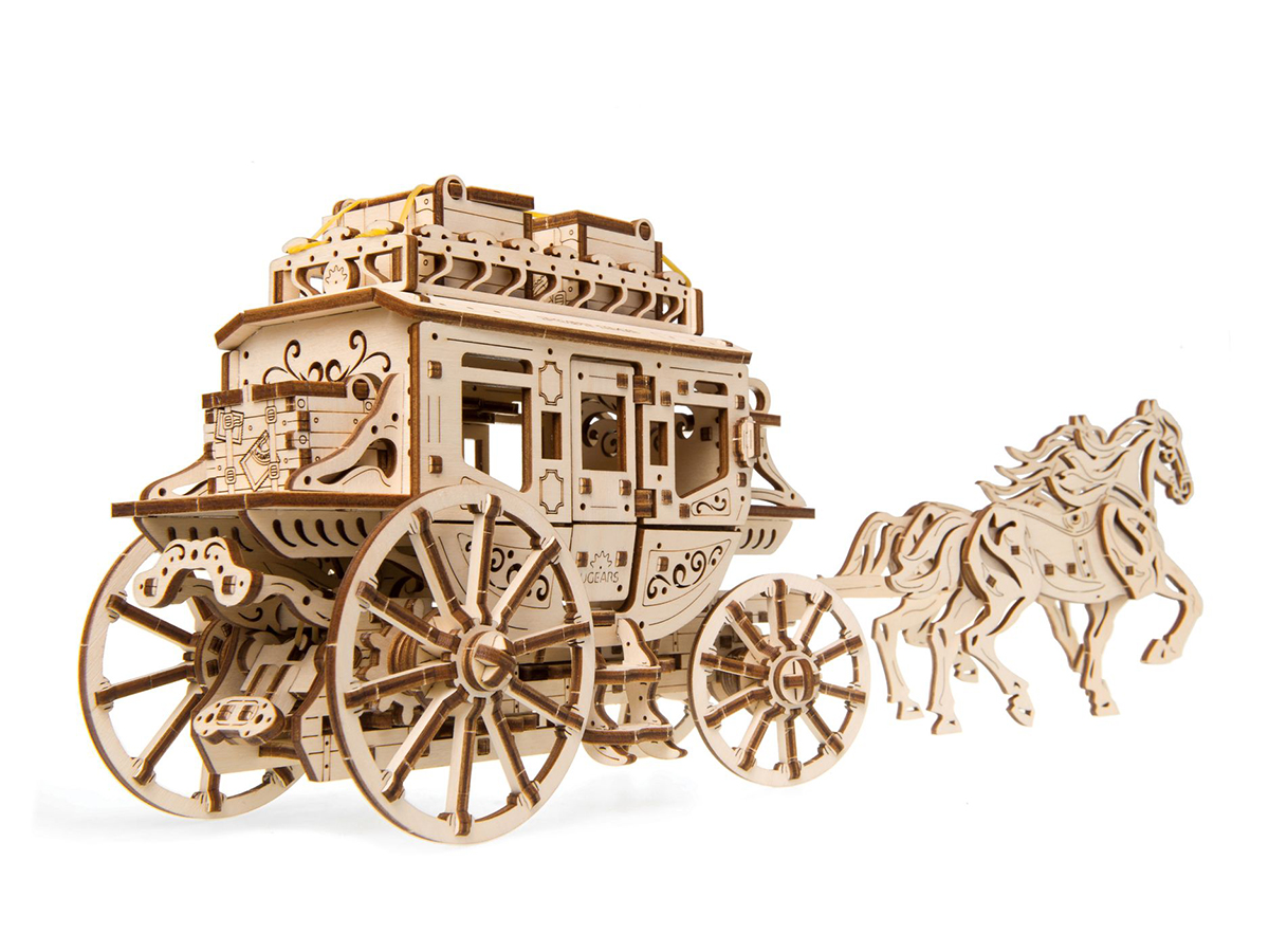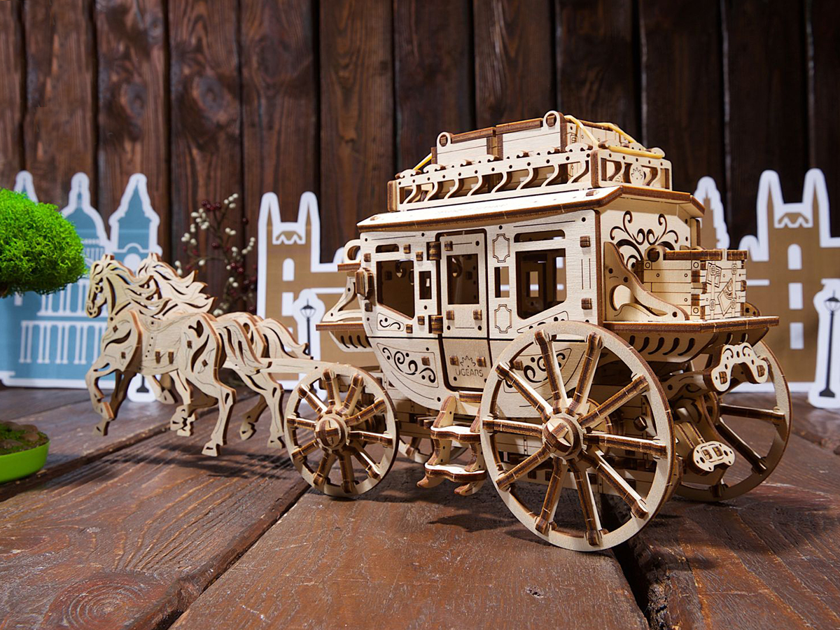 3D-пазл UGears Stagecoach представляет собой настоящий почтовый дилижанс XIX века. Тогда дилижанс поставлял письма, посылки и деньги, а теперь его уменьшенную копию можно воссоздать в кругу семьи. При этом из пазла собирается не только дилижанс и кони, но и встроенный механизм, который позволит по-настоящему отправлять послания домочадцам.