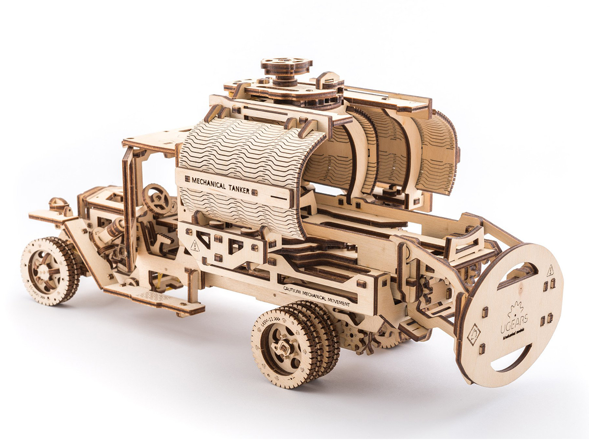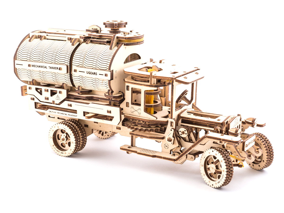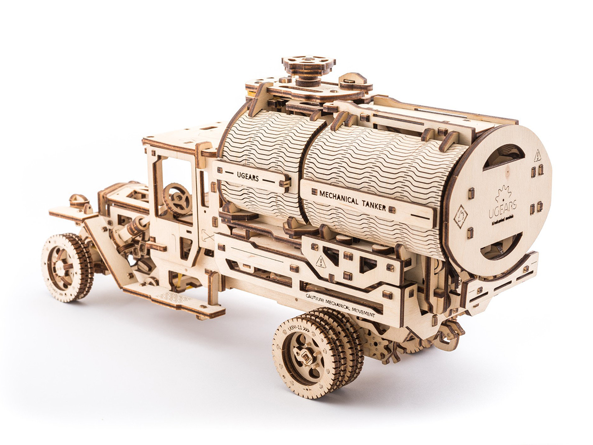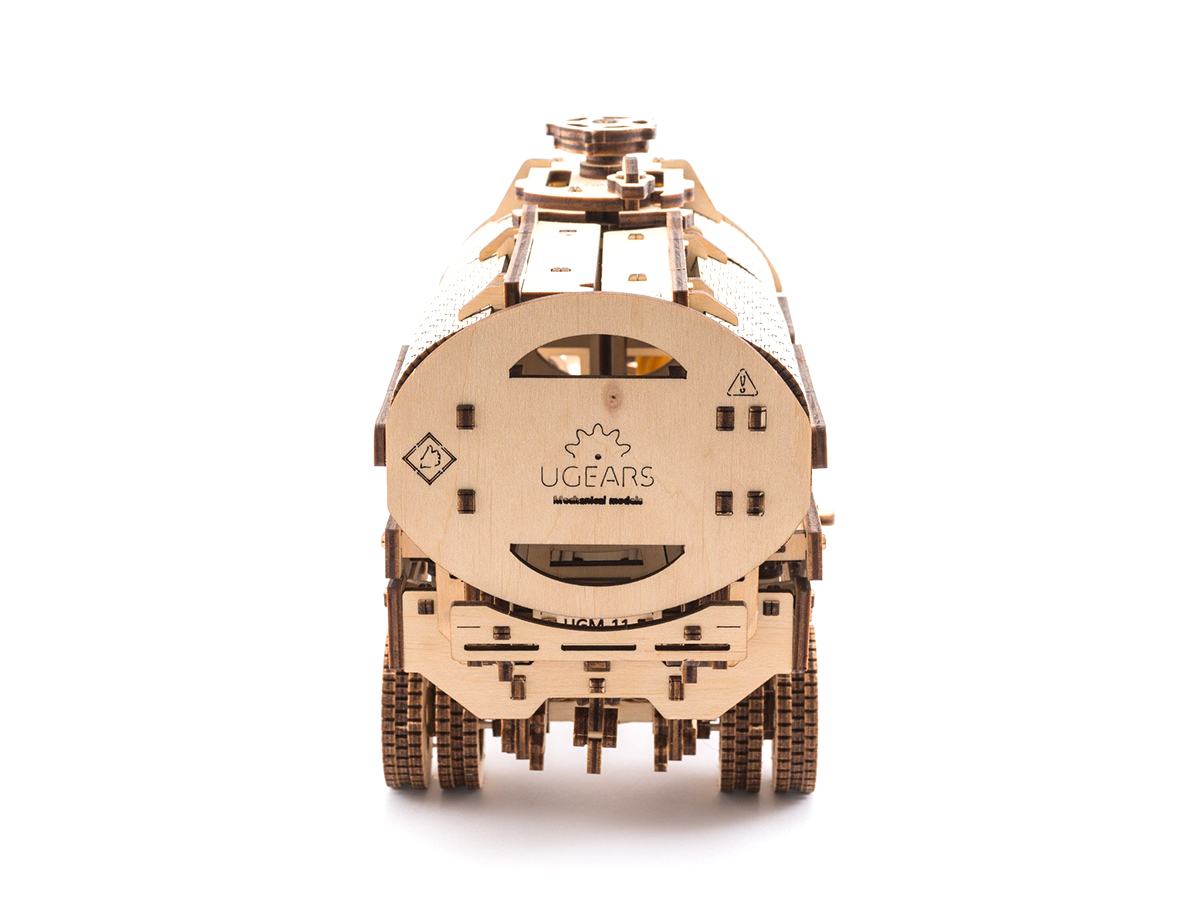 Самоходный автомобиль-цистерна на резиномоторе дополнил коллекцию деревянных автомобилей UGEARS. Стабильный в работе резиномотор посредством подвижных шестерен приводит в работу четырехцилиндровый двигатель. Сбоку модели есть небольшой рычаг, который с характерным щелчком переключает режимы холостого ряда, вперед и назад.