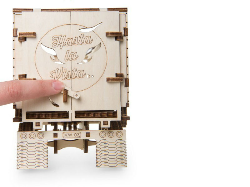 Все детали вырезаны на фанере высокоточным лазером. Перед сборкой их нужно извлечь из заготовки. Все детали соединяются на пазы, вам не понадобится клей или специальные крепежи. Сборка прицепа включает в себя несколько этапов. Стоит начать с меньших частей, чтобы сформировать большие блоки: колёсную базу, кузов и автоматизированный конвейер. Подробная и понятная инструкция ускорит процесс.