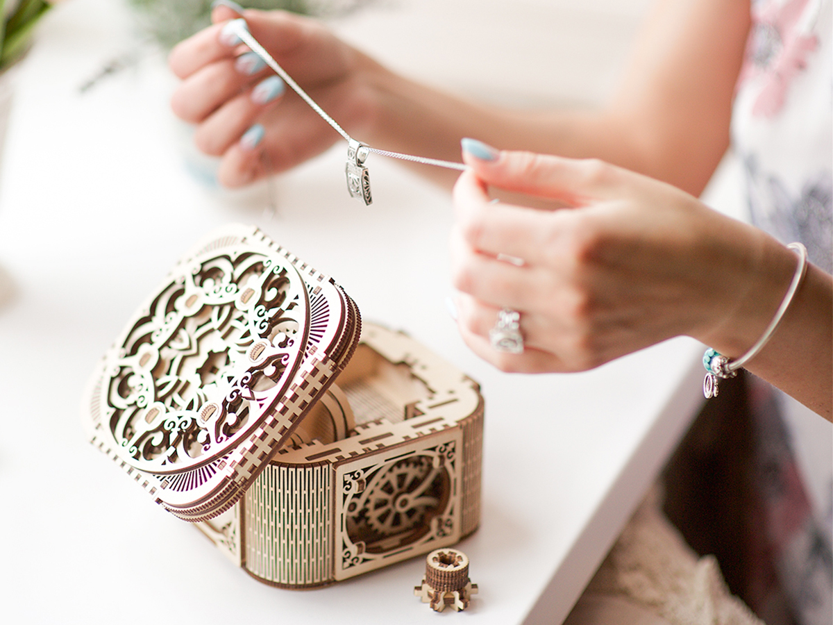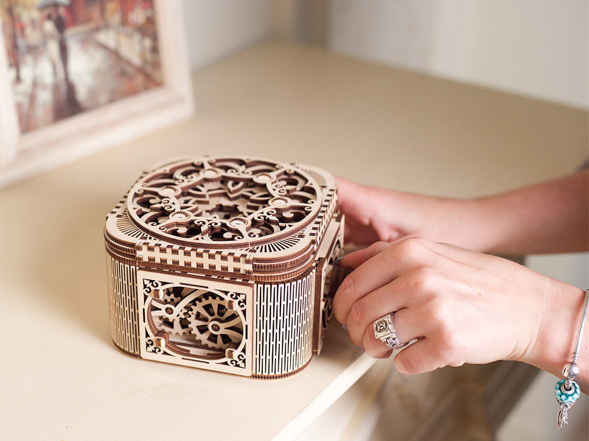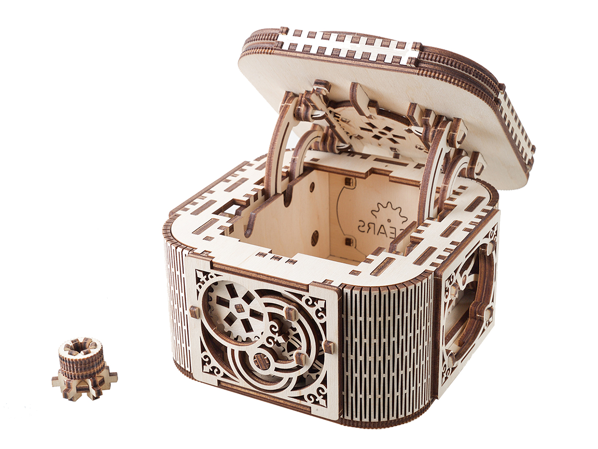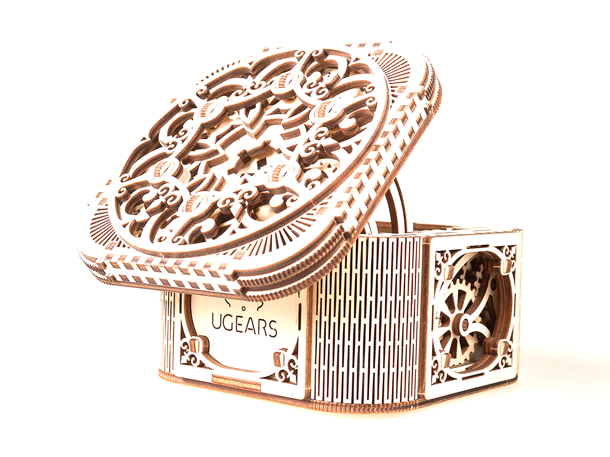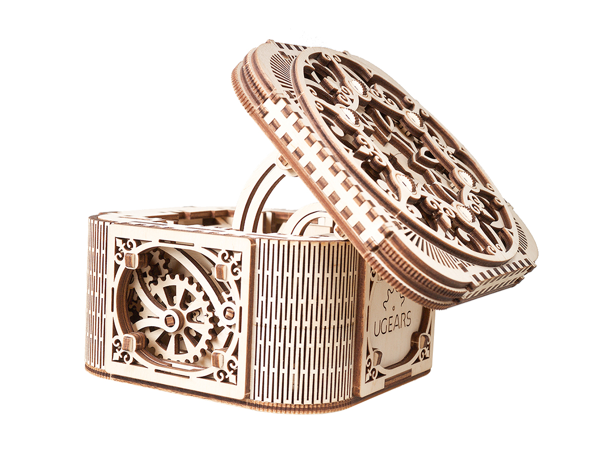 UGears Шкатулка с секретом (Treasure Box) по праву считается жемчужиной коллекции механических 3D-пазлов UGears. Шкатулка в стиле стимпанк отличается изысканностью линий и уникальным механизмом: чтобы добраться до сокровищ, спрятанных внутри, необходимо решить сложную головоломку. При этом модель изготовлена из экологичной древесины и собирается без использования клея. Это идеальный вариант для любителей по-настоящему сложных конструкторов.