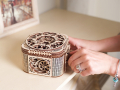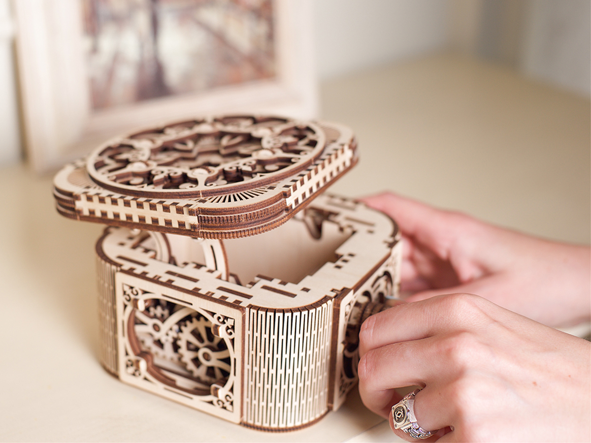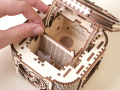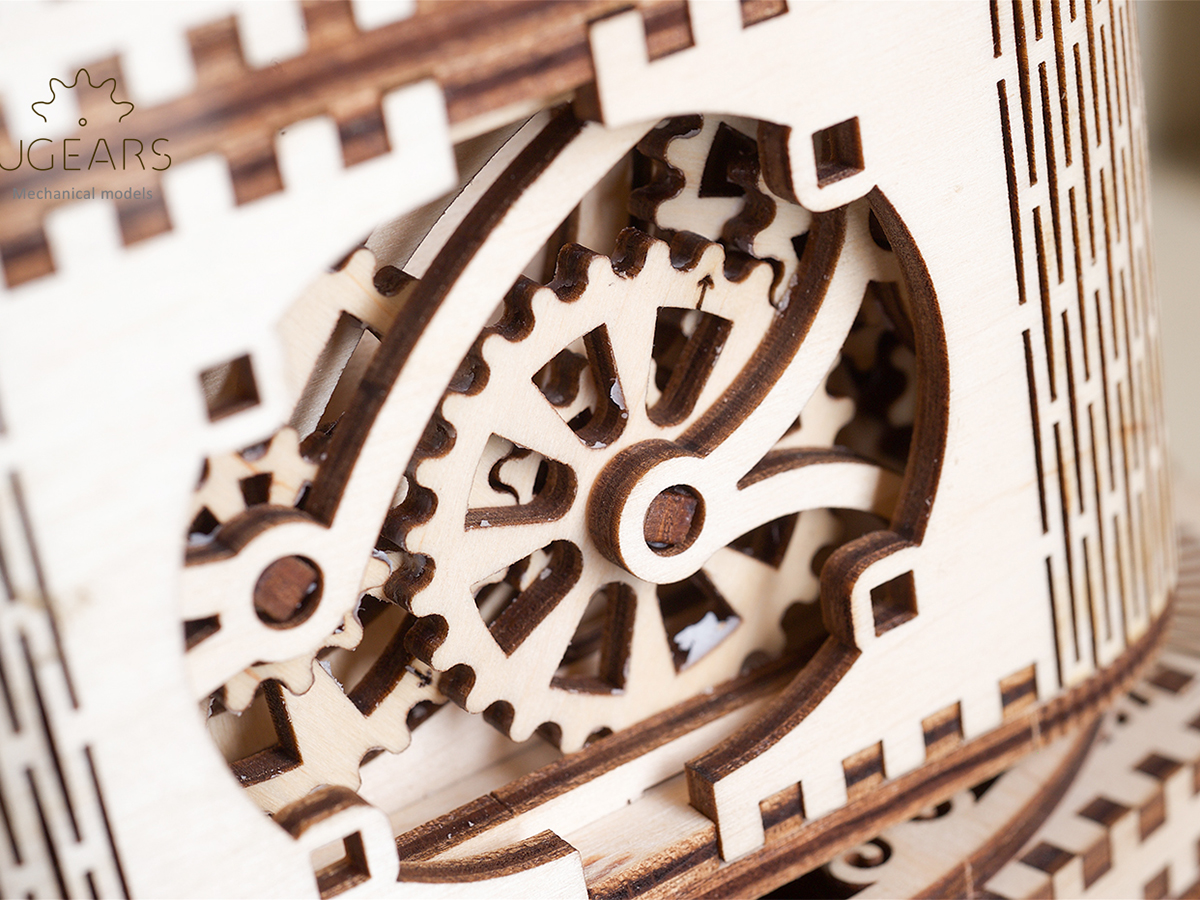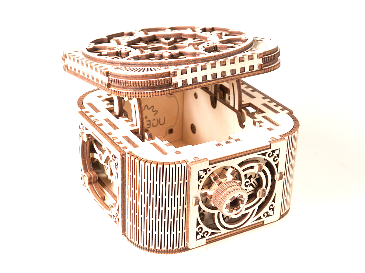 UGears Шкатулка с секретом ― это коробка-головоломка. Для того, чтобы добраться до её содержимого, придется проявить всю свою смекалку. Шкатулка открывается ключом, который встроен в крышку, но есть один момент: чтобы этим ключом воспользоваться, надо вынуть его из механизма. Для этого нужно поворачивать ключ против часовой стрелки до тех пор, пока шестерни не будут находиться в нужном положении. Всего пазл состоит из 190 деталей. На сборку требуется примерно 2-3 часа.