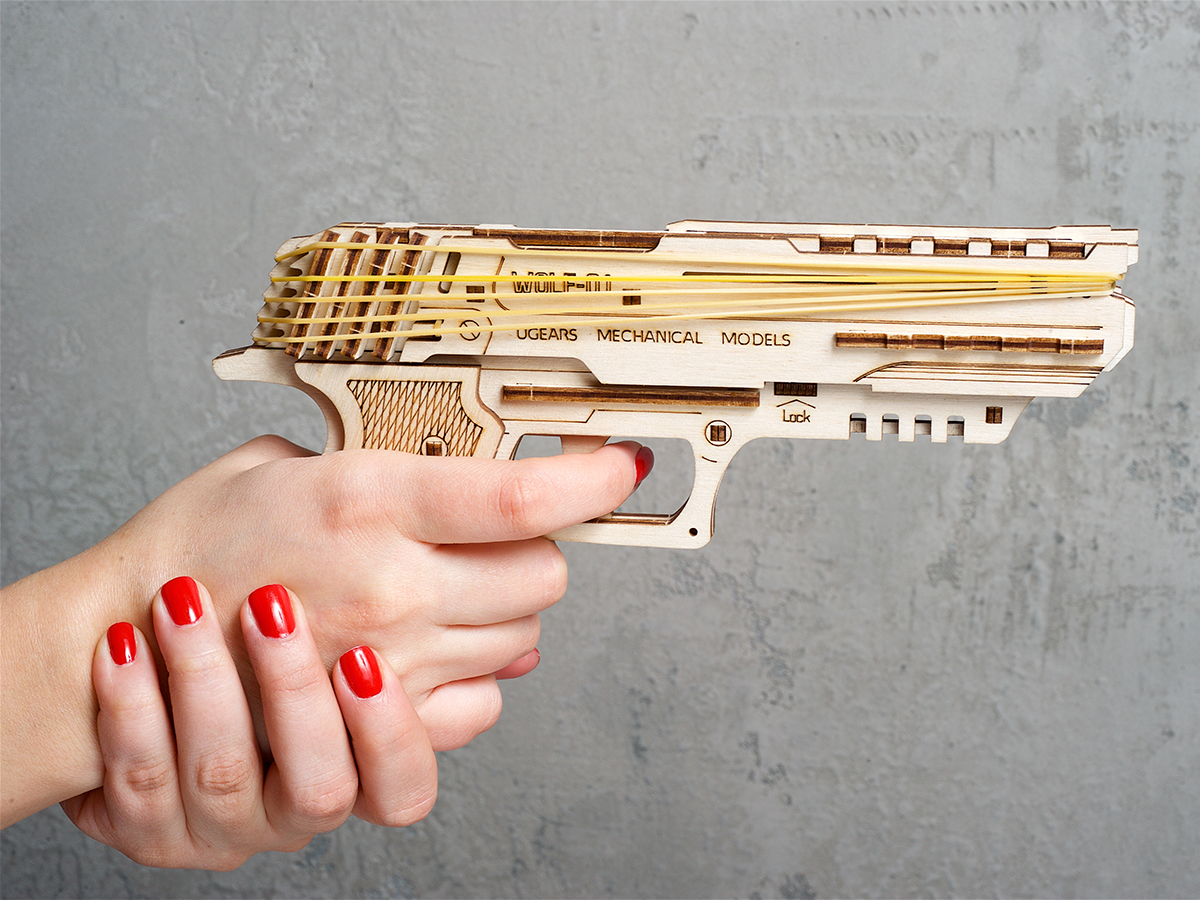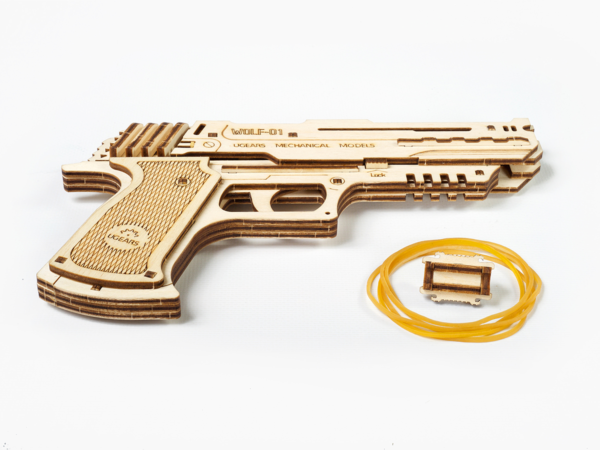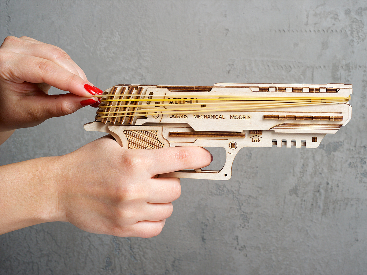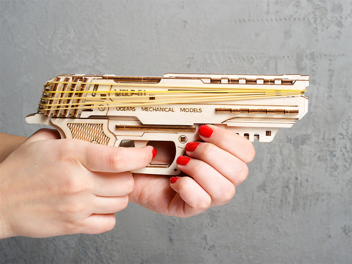 Украинский производитель 3D-пазлов Ugears всегда знает, чем удивить своих фанатов. В арсенале бренда уже есть автомобили на резиномоторе, шкатулки и сейфы со сложными замками, поезд и станция для него и даже функционирующий музыкальный инструмент Харди-Гарди. В начале 2018 года компания представила свету свое новое творение: Пистолет Вольф-1 – модель настоящего пистолета.