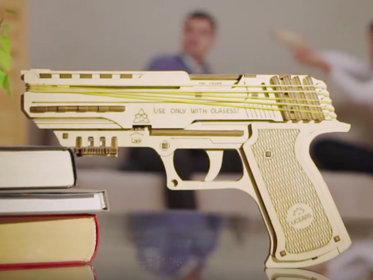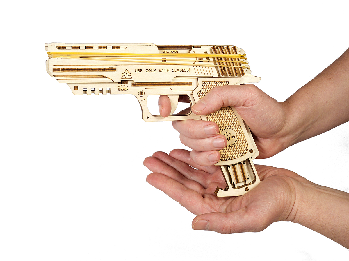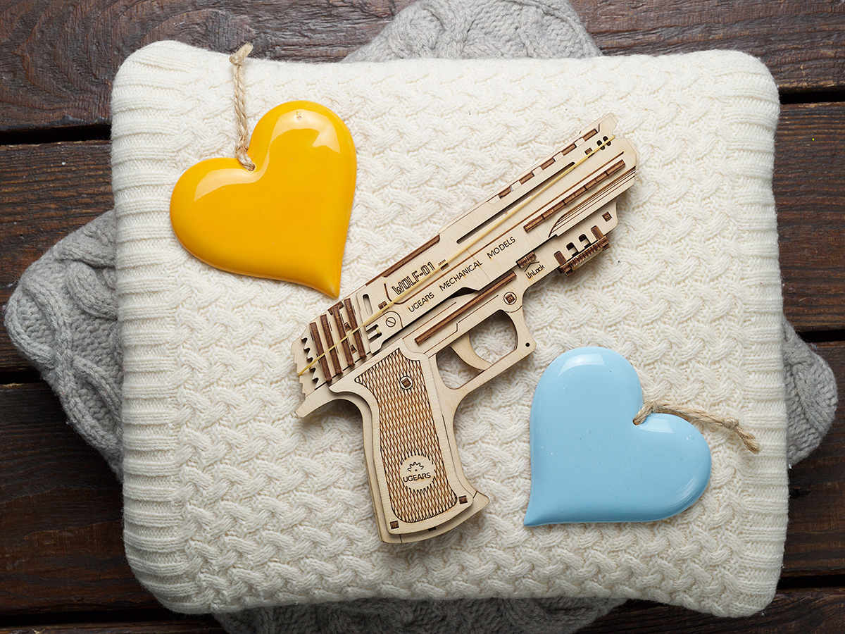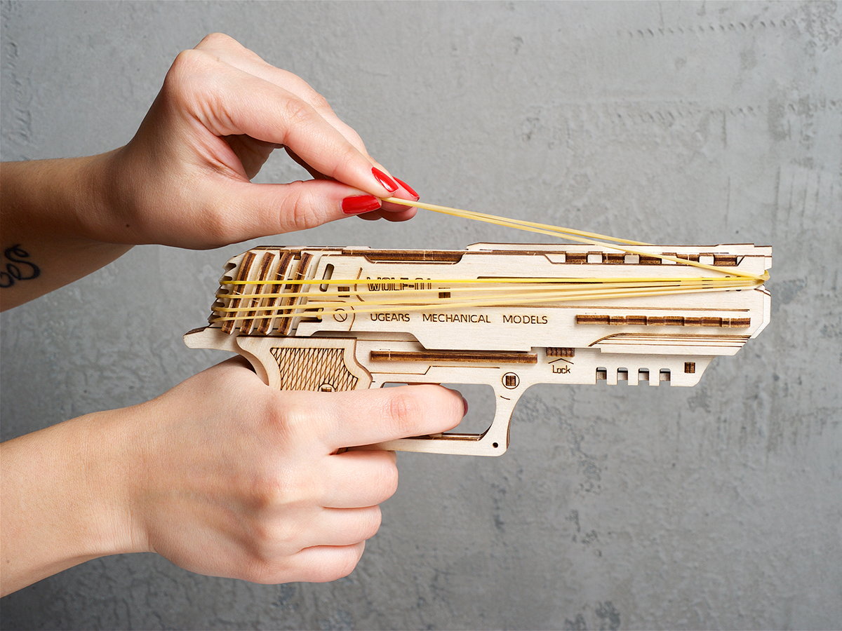 Украинский производитель 3D-пазлов Ugears всегда знает, чем удивить своих фанатов. В арсенале бренда уже есть автомобили на резиномоторе, шкатулки и сейфы со сложными замками, поезд и станция для него и даже функционирующий музыкальный инструмент Харди-Гарди. В начале 2018 года компания представила свету свое новое творение: Пистолет Вольф-1 – модель настоящего пистолета.