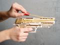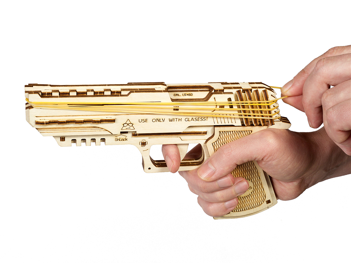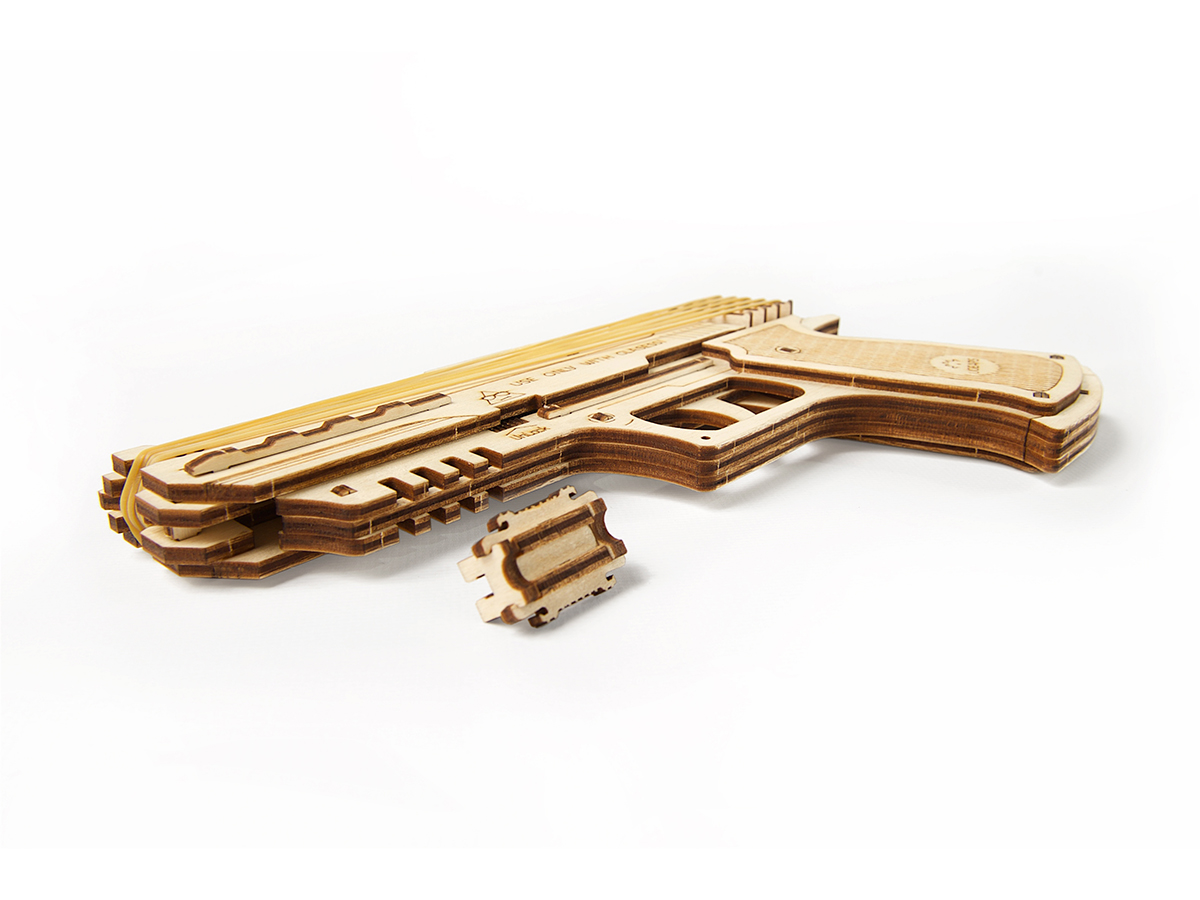 Как и все модели Ugears, пистолет Пистолет Вольф-1 изготовлен из натуральной древесины, а все его детали вырезаны с помощью программируемого лазерного станка. Пистолет Вольф-1 – это функционирующая модель, поэтому сразу после её сборки можно устроить соревнования в стрельбе по мишеням – это не только снимает стресс, но ещё и абсолютно безопасно, ведь стреляет пистолет обычными канцелярскими резинками.